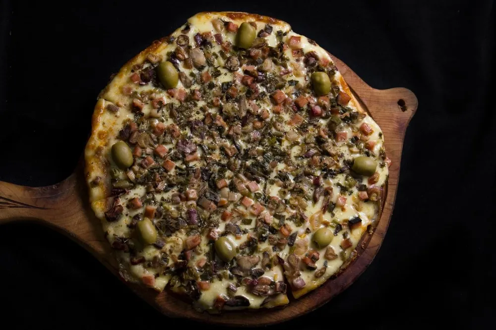 Salsa de tomate, mozzarella, panceta, verdeo y champignones.