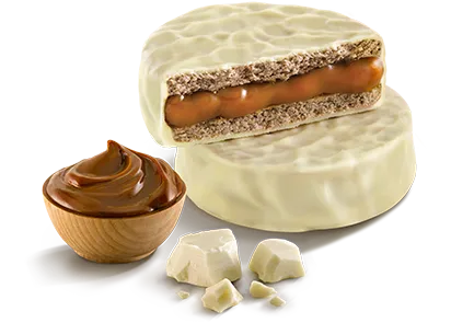 Alfajor cubierto de chocolate blanco relleno de dulce de leche.