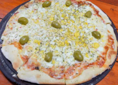 Salsa de tomate, muzzarella, jamón, morrón, orégano, aceitunas verdes, huevo.