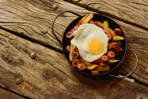 Salsa, salchichas y huevos fritos.