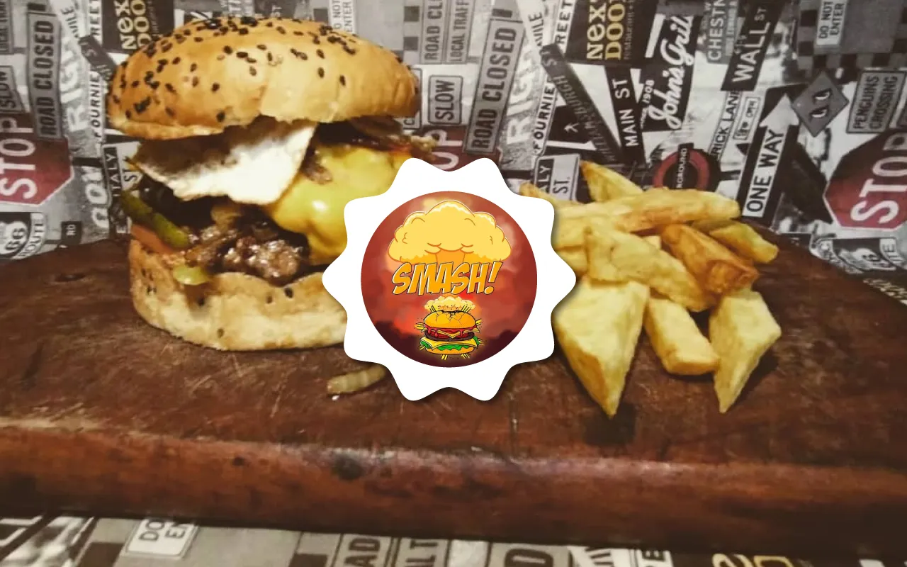 BIG SMASH:Carne 150grs, queso , bacon ,pepinillos, cebolla brunoise , salsa big smash, papas.