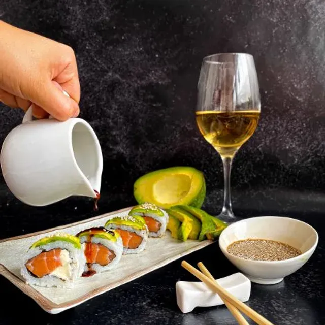 8 Piezas. Relleno de salmón y queso phila cubierto con laminas de palta, y salsa Buenos Aires